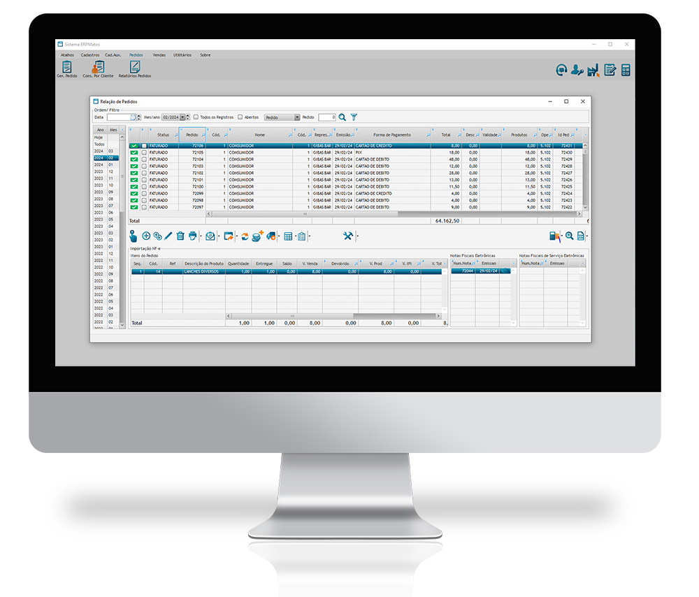 Controle pedidos, ordens de serviço, orçamentos e locações. Integrado com o módulo de NF-e e NFS-e, ele possibilita a geração automática dos documentos fiscais.